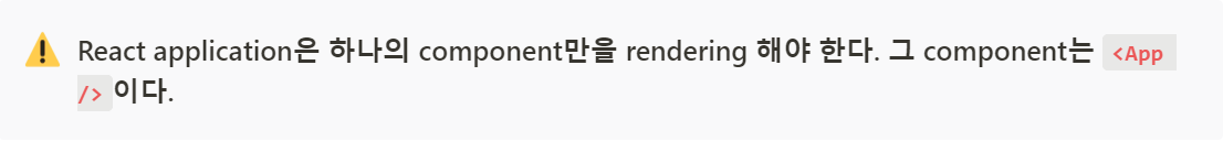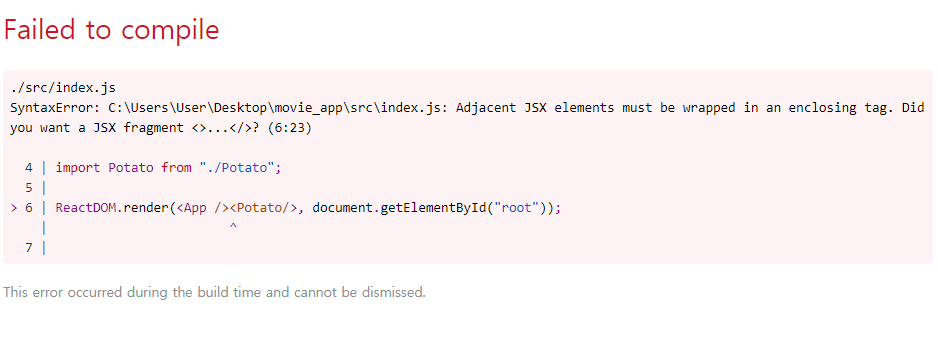 위의 예제코드에서 ReactDom.render(<App /><Potato />, document.getElementById("root"));처럼 component를 두 개이상 사용할 수 없다. 만약 사용하면 아래와 같은 failed to compile이 뜬다.