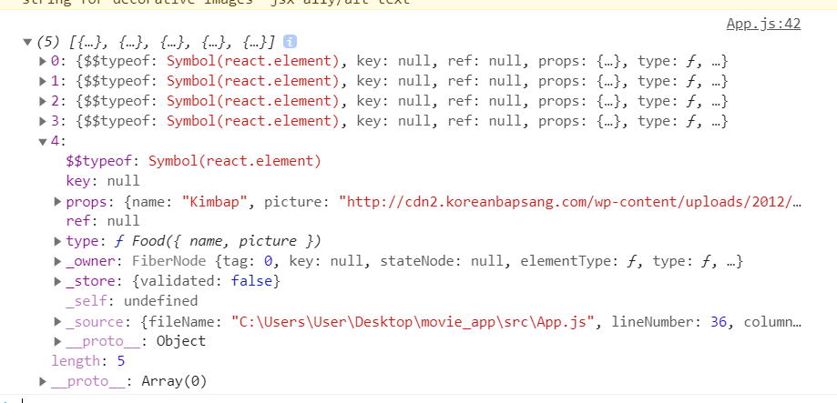 실행 결과는 아래와 같이 React component가 들어있는 배열이 나온다.