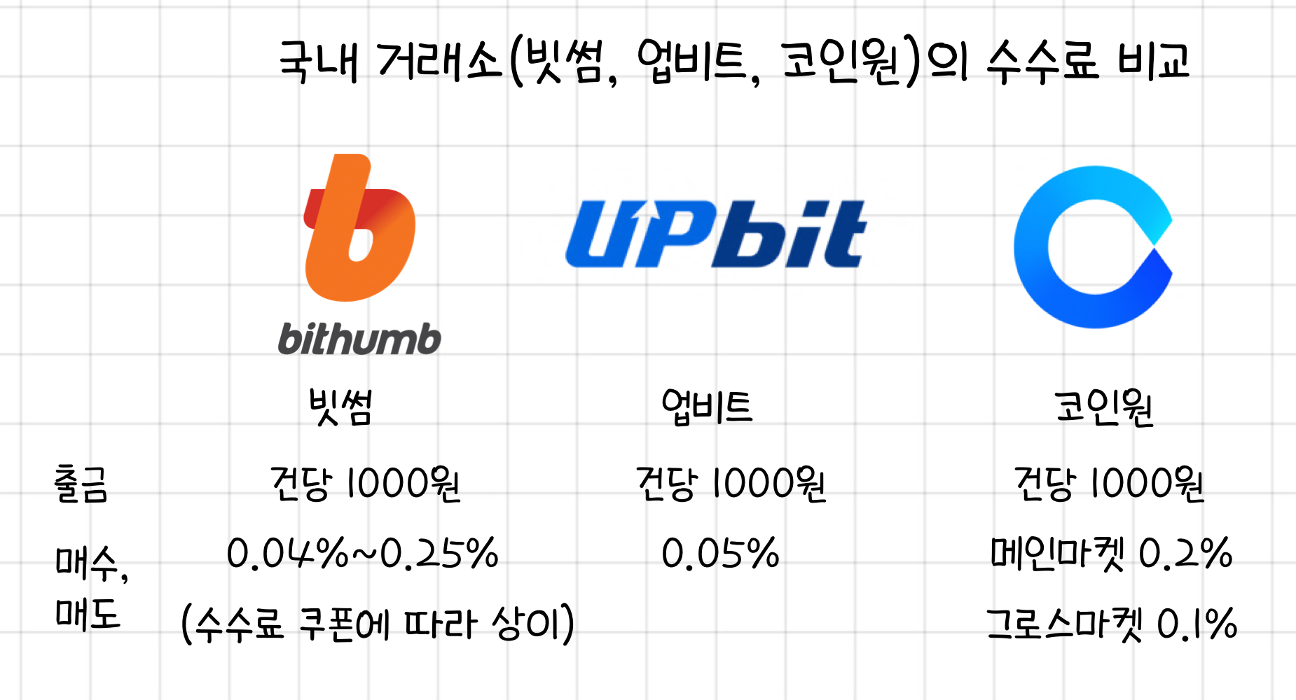 국내 거래소 (빗썸, 업비트, 코인원) 수수료 비교 (원화기준)